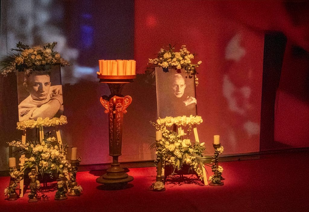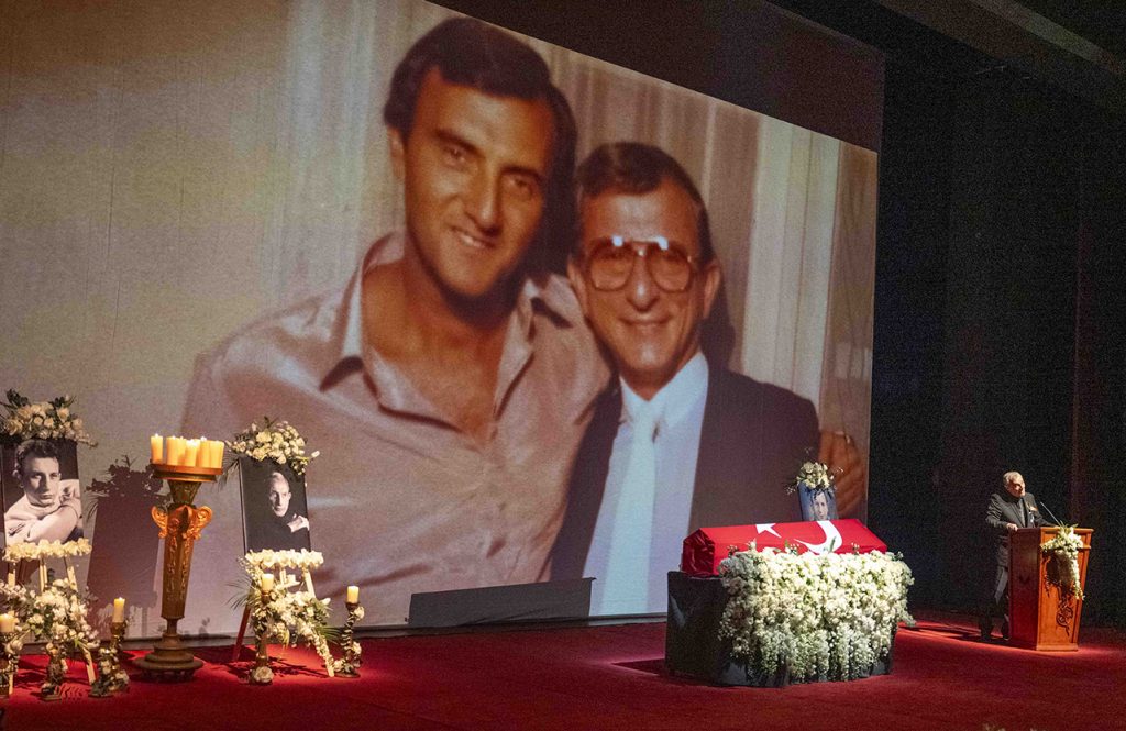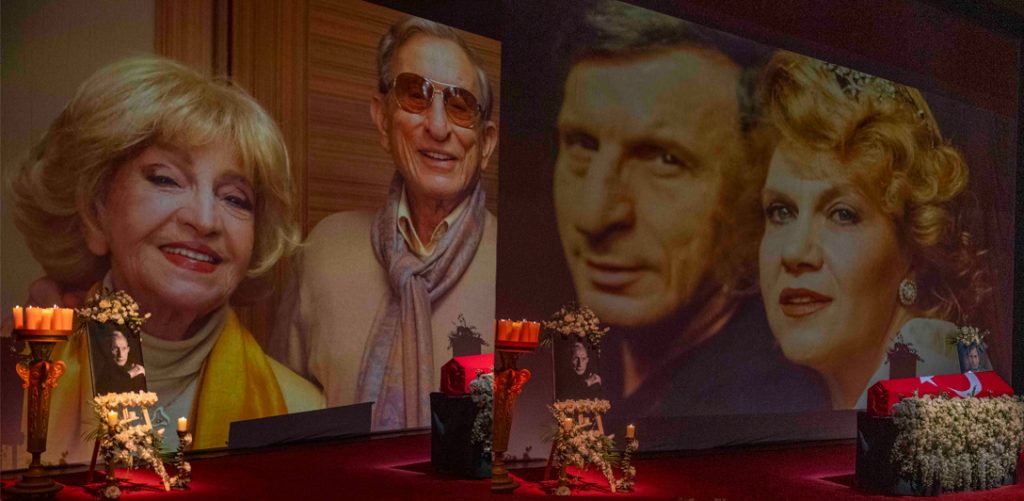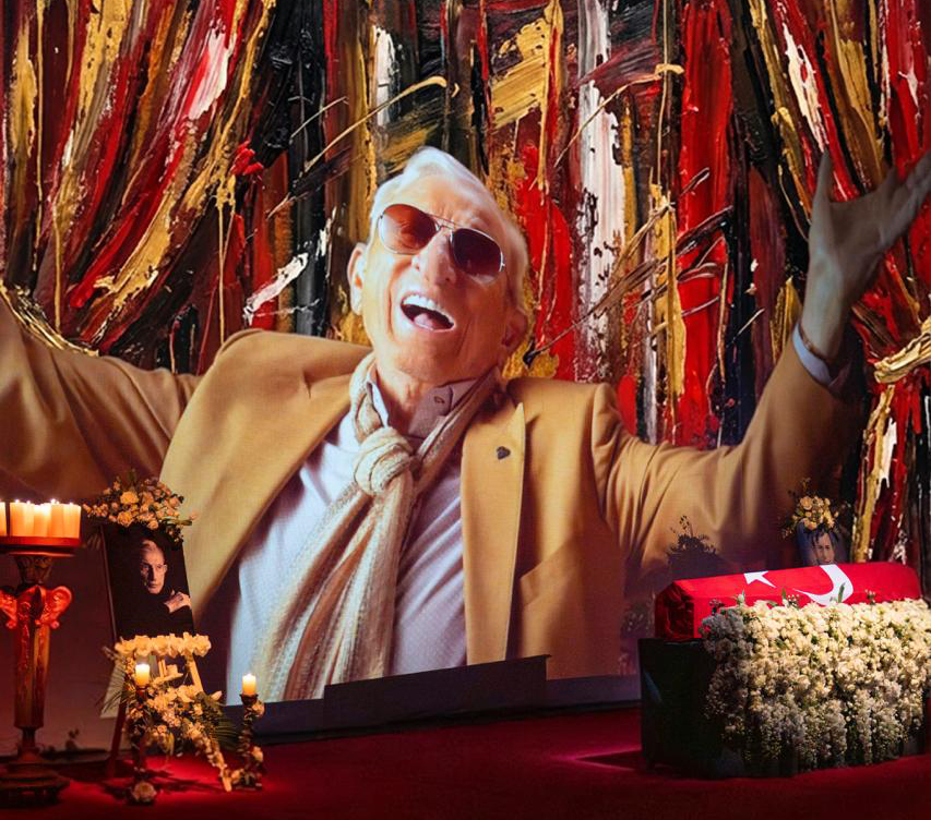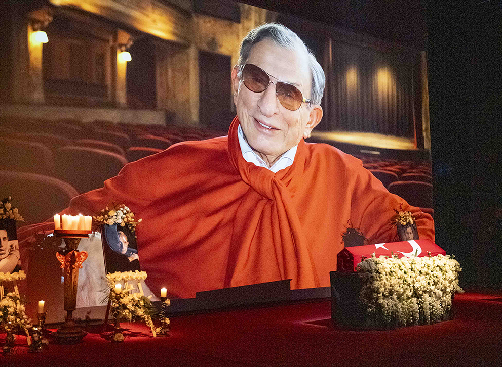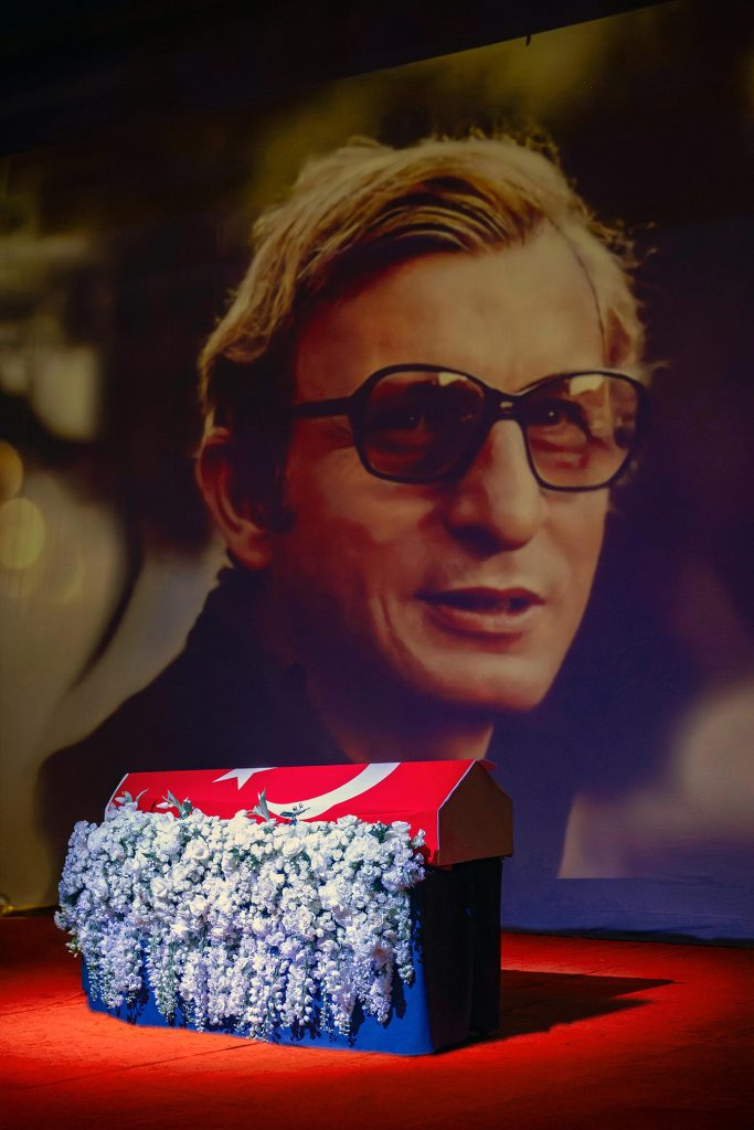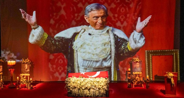 Haldun Dormen, sahnenin ortasında, ay yıldızlı bayrağa sarılı tabutun içinde, beyaz çiçeklerin üzerinde yatıyor. Korkutucu filan değil, sevgi dolu, ışık dolu… Zaten, bu da bir cenaze töreni değil, bir ustanın sahneye son çıkışı. Her detay düşünüldü. Her şey ölçülü. Hiçbir şey bağırmıyor. Hiçbir şey eksik değil. Tam da Haldun Dormen’in ustalığına uygun.